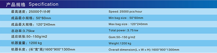 2、配有吸氣滾筒的柵欄定位折疊機(jī)構(gòu)可高速、準(zhǔn)確地完成兩次橫折,信封(紙袋)的寬度可不停機(jī)調(diào)整。